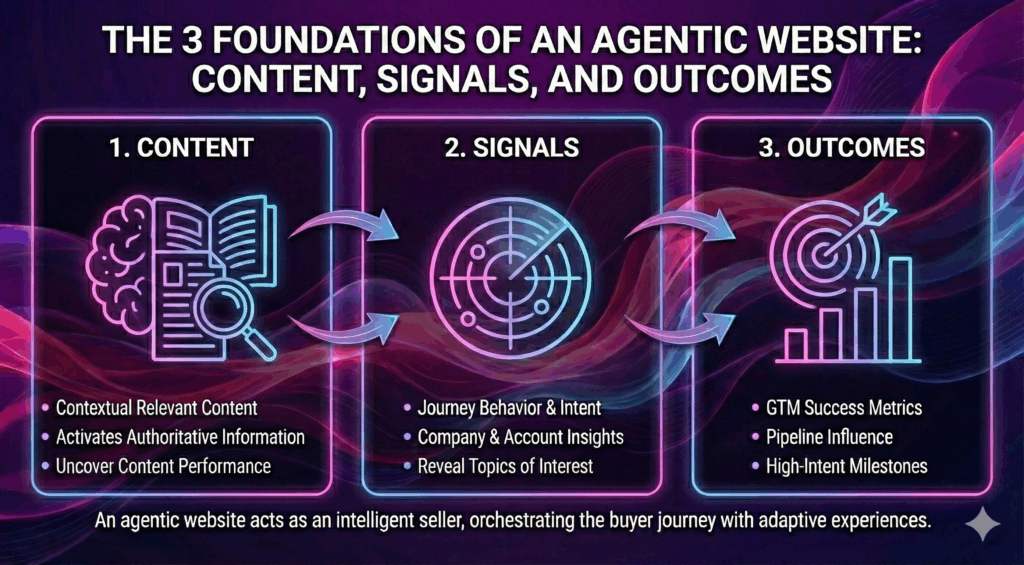 The ideal agentic website operates as if there is a dedicated agent for every visitor, guiding them through the most effective decision path based on who they are, what they care about, and where they are in their journey. But that only becomes possible when the website has a “brain” with ongoing access and interfaces to three foundations: content, signals, and outcomes. Content is not only the pages and assets you publish, but also an understanding of which piece performs best, which narratives work for different personas, and how to answer the questions that buyers actually ask. Signals provide the context—company attributes, account-level insights, journey behavior, and intent indicators that reveal what the visitor is trying to accomplish. Outcomes give the system its direction—metrics like account score, high-intent indicators, pipeline influence, and the milestones that define success for your GTM motion.