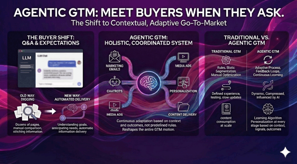 Buyers are now used to Q&A interactions in LLM chats, where they can ask highly specific questions and receive precise, contextual answers instantly. But the bigger shift isn’t just how they research—it’s their expectation that the work will be done for them. They don’t want to dig through dozens of pages, compare options manually, or stitch together the story on their own. They want an experience that understands what they’re trying to achieve, anticipates what they need next, and automatically delivers the right information to support their decision making process. That’s why GTM must evolve to Agentic GTM: an approach designed to enable the agentic buyer process, meet buyers where they are, and actively guide them forward—even when they move fast, stay anonymous, and leave fewer traditional intent signals.