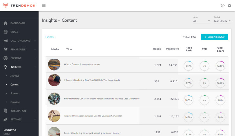 TrenDemon’s Content Insights provide you with a clear picture of how your content is performing in relation to your goals. You can see their read rate (how many people that visited the page, actually read it), the CTR (how many people that viewed the item on our content recommendations unit actually clicked on it) and the goal/journey score – the significance of the page to the conversion process (in other words, how many times did it appear in successful journeys vs. all journeys that passes through it).