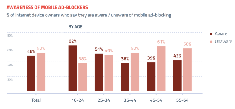 A study from May 2017 by AdBlock shows 40% of laptops in the US now employ ad blockers. 15% of mobile devices do as well. This number is growing and will continue to do so. Note below how adblock awareness becomes more prevalent for younger audiences. In other words, if your audience isn’t that aware of ad blocking, your future audience sure is.