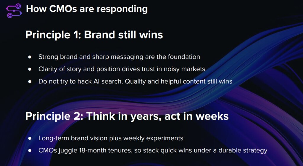 Additional takeaways are the renewed importance of brand, positioning, authenticity, and internal alignment across marketing, sales, customer success, and even product teams. The leaders who joined us shared sharp, candid perspectives on what they’re doubling down on—and what they’re abandoning entirely.