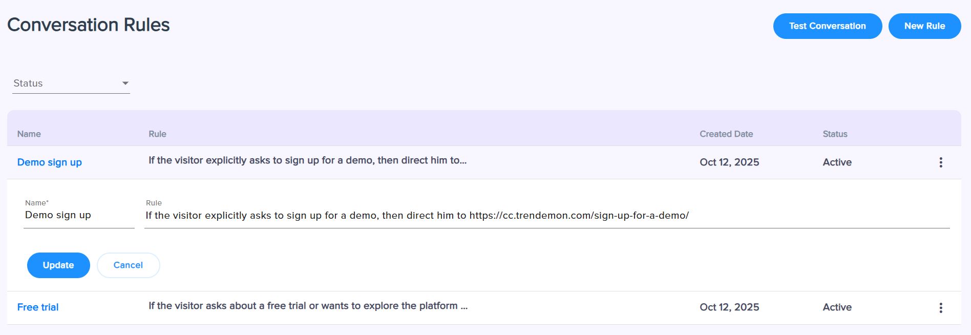 Define specific conversation rules to ensure every AI interaction aligns perfectly with your brand tone and business goals. You can guide the chat to steer specific requests toward high-value actions, such as booking meetings, visiting product pages, or starting free trials.